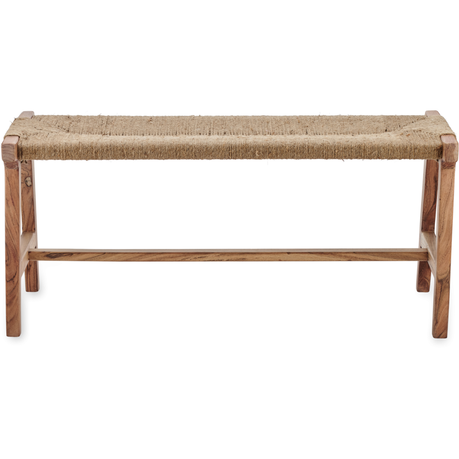 The woven jute seat follows a traditional Indian pattern and adds a softness to the bench's aesthetic.