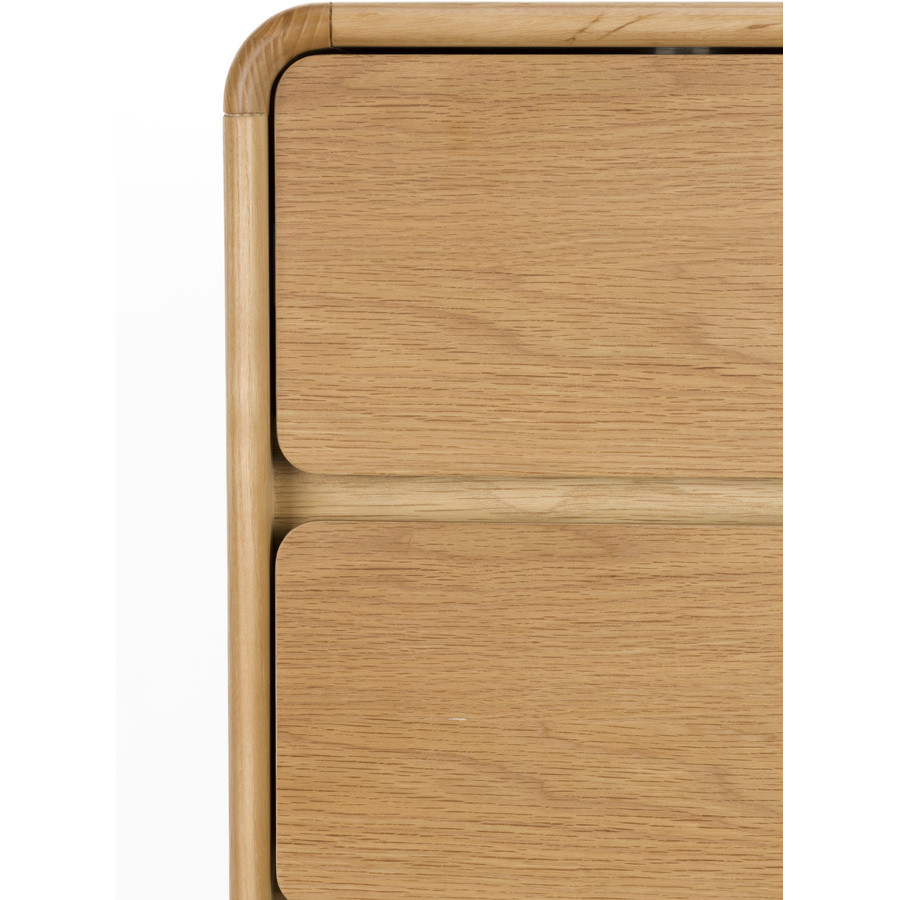 From the bedside table to the wall and chest of drawers, these pieces stand out with rounded lines that immediately catch the eye.