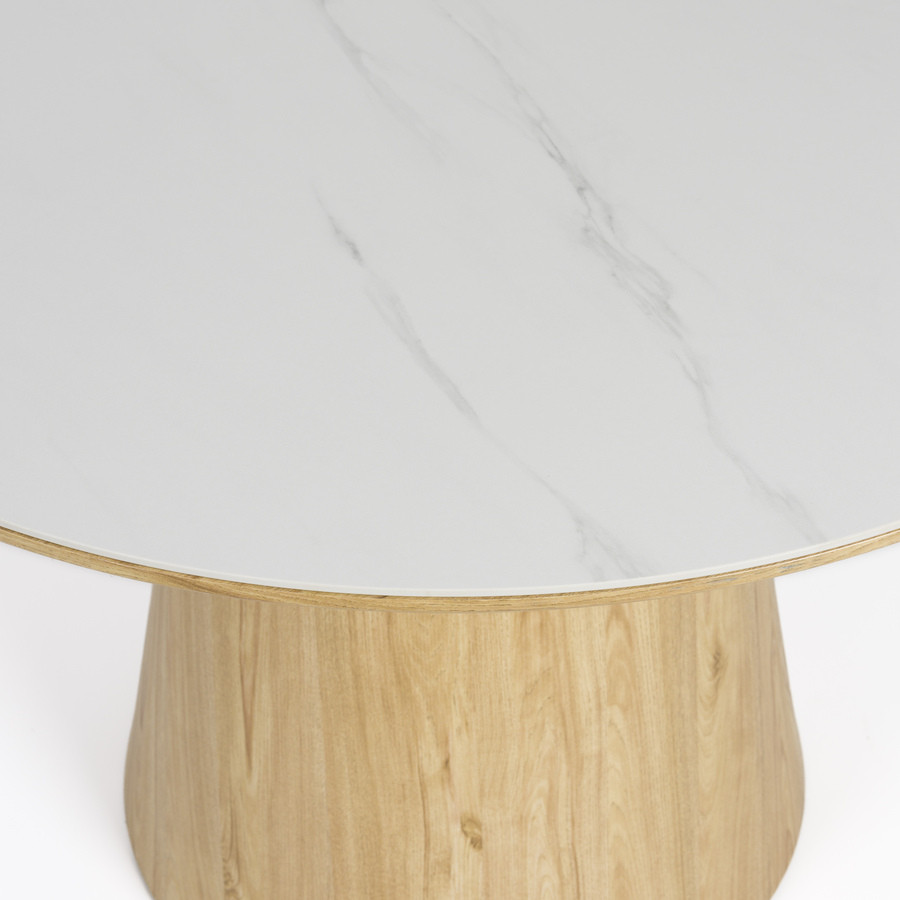 Combine calm, warmth, and refinement in your interior with this stylish furniture series featuring a wood-look finish and marble-look top. The combination of natural wood tones and the elegant, light surface creates a timeless appearance that effortlessly fits both modern and more classic interiors.