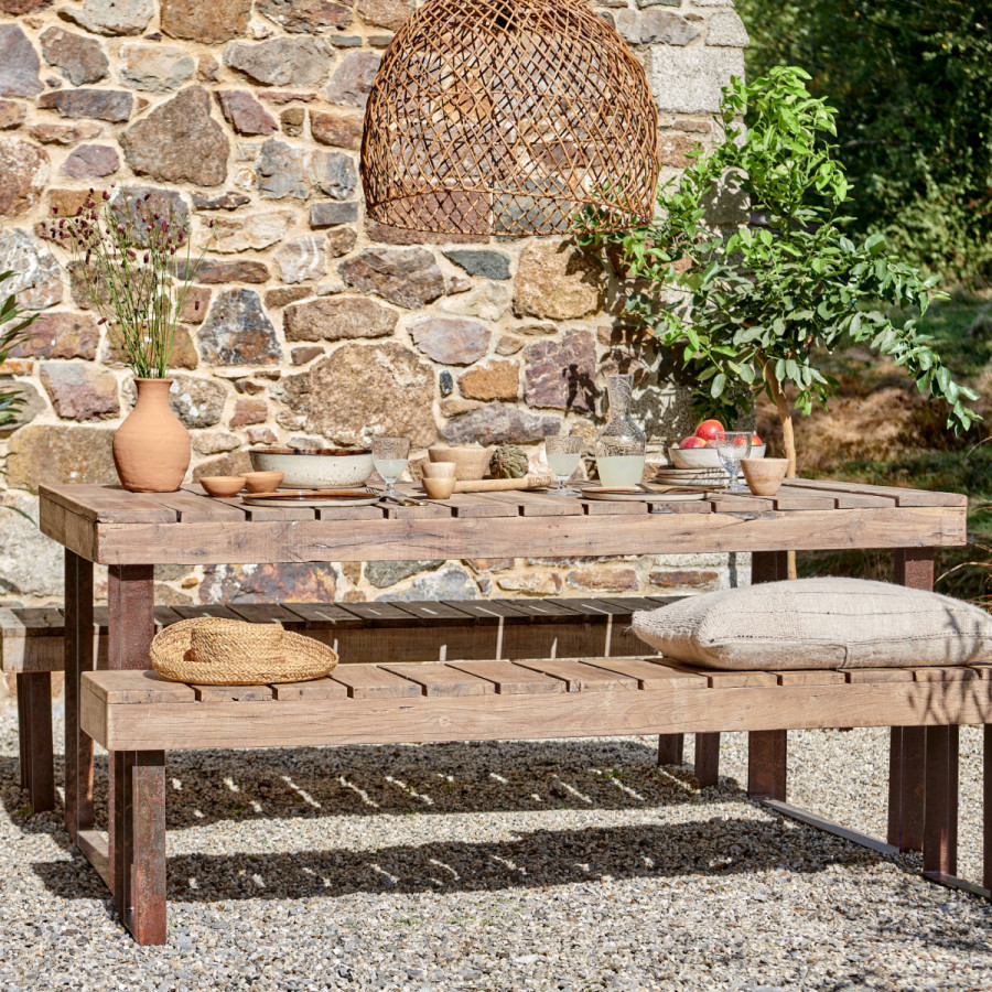This Oso dining table is made from reclaimed wood that is rich with character and texture. The angular legs are constructed from sturdy iron, providing an eye-catching design twist that sharpens the reclaimed look of the piece. Dress an outside space, conservatory or terrace and pair with our Oso bench.