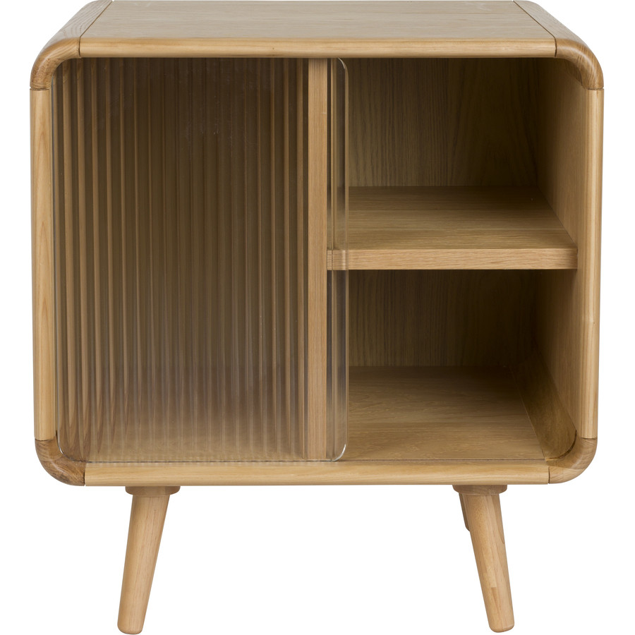 Opt for a light oak finish or warm walnut, and enjoy the playful touch added by the ribbed glass sliding door on the bedside and wall cabinets.